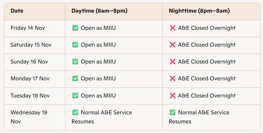 - Overnight (8pm–8am): The department will be closed overnight from Friday 14 November until 8am on Wednesday 19 November, when normal A&E services will resume.