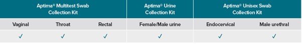 Sample requirements and Aptima collection kits